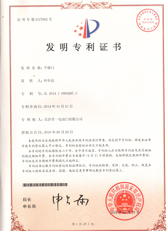 平移門發明專利證書